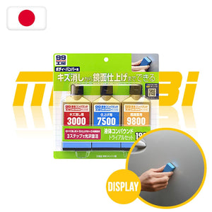 這個套裝分「細目」、「中細」及「極細」三支。「細目」粒子平均約10-15µm,三支之中最粗,除了去掉淺痕外,亦適合用來清除柏油、鐵銹等污漬。「中細」粒子平均約3µm,可用來清除「細目」的打磨痕跡及車漆面的凹凸不平。「極細」粒子平均約1µm,三支之中最幼細,除了用來清除「中細」的打磨痕跡外,亦用來拋光出鏡面效果,增強光澤。亦適合用來清除金屬、雲母色車的污垢。